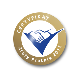 W plebiscycie "Złoty Płatnik 2015" nasza firma osiągnęła najwyższe standardy dyscypliny płatniczej, spełniając wszystkie rygorystyczne kryteria procesu weryfikacyjnego.