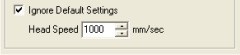 Po zaznaczeniu "Ignore Default Settings" / "Ignoruj standardowe ustawienie" możliwa jest zmiana prędkości posuwu karetki. Zwalniając karetkę można usunąć problemy związane z pyleniem atramentu spowodowane elektryzowaniem się materiału oraz usunąć problemy z rozlewaniem się atramentu w mocno nasyconych kolorach lub druku w trybie "Overprint" / "Naddruk" x2 - druk ten jest wykorzystywany przy druku na materiałach do podświetleń.